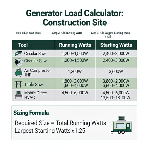 Here’s where most site managers over-order: they add up every tool and every circuit at full load simultaneously. In reality, not every tool runs at the same time.